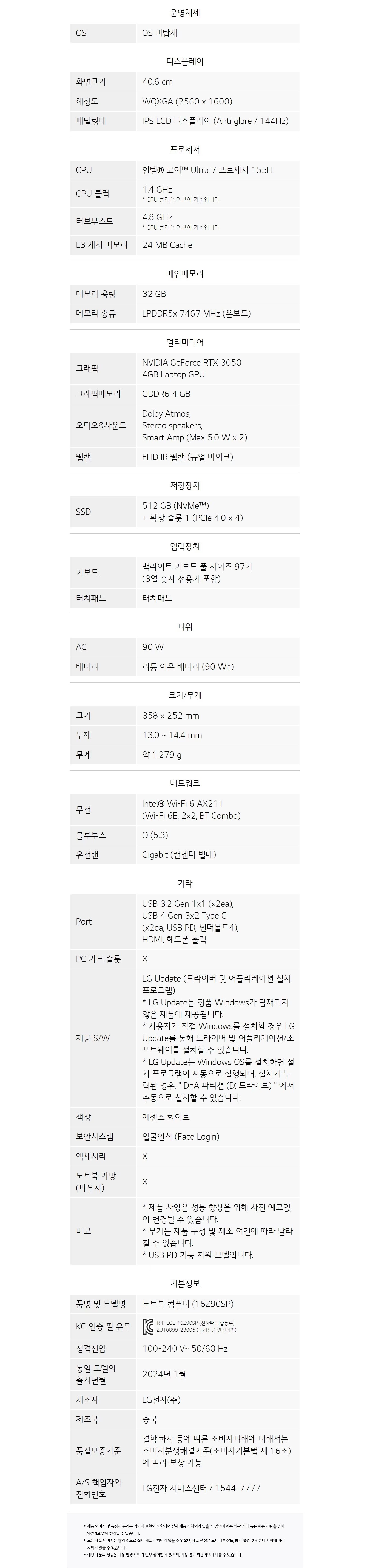 HOME > LG전자 > LG그램 > LG전자 그램 프로16 16ZD90SP-EX79K (SSD 512GB)